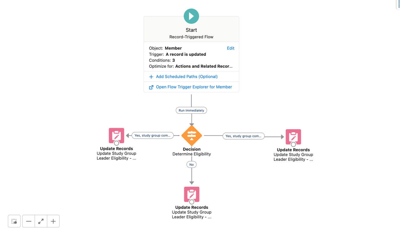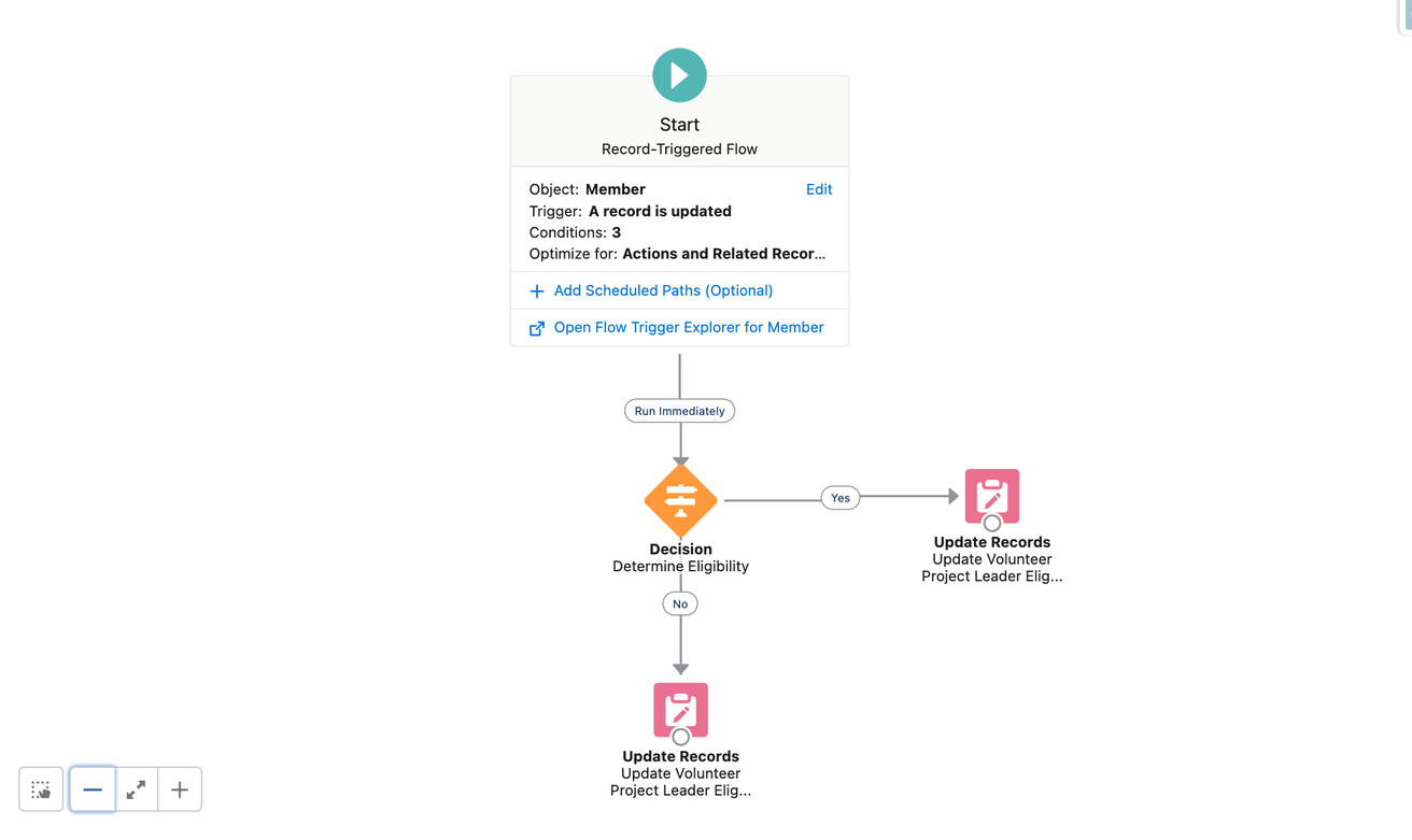 FlowsHere are two examples of flows that I created. Both were designed to determine the eligibility of a member to become a program leader. The flows are record-triggered and update an eligibility picklist based on various data points of the member.