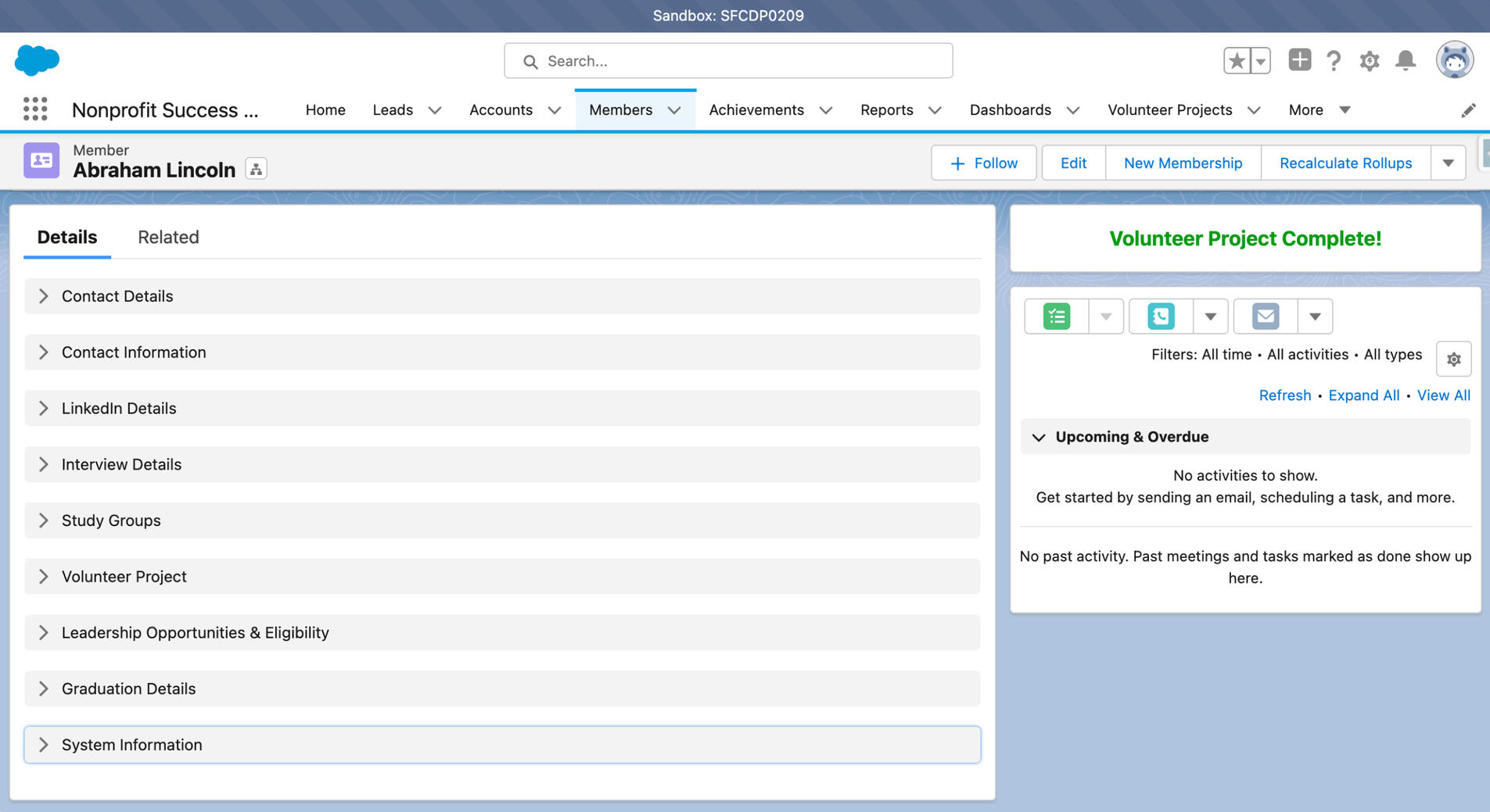 As a member of a highly collaborative team of four, I played a crucial role in breaking down project requirements and ensuring their successful implementation. Working closely with my teammates, we effectively communicated with our client/project manager to incorporate feedback and continuously improve the quality of our end product.In this particular project, our client utilized the Nonprofit Success Pack to track program contacts and their journey from initial Salesforce certification to eventually landing a job. To meet their specific needs, my team was tasked with completing just over sixty requirements within a tight three-week timeframe. With careful planning, diligent execution, and a keen eye for detail, we were able to deliver a highly effective solution that met and exceeded the expectations of our client.