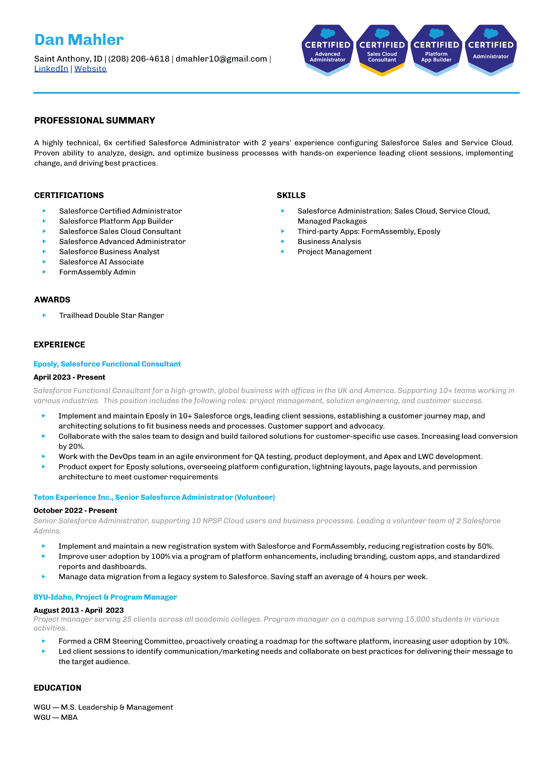 Welcome to my portfolio! My name is Dan, and I am a Salesforce professional, project manager, strategist, and team leader with a passion for helping businesses optimize their processes, improve efficiency, and make a positive impact.With my experience in the industry, I have developed a deep understanding of Salesforce and its capabilities, as well as a proven track record of successful implementations and customizations. My expertise extends beyond just the technical side of things, however. With 10 years of experience in outdoor and higher education, I have become a skilled project manager, team leader, and strategist. I am adept at working with stakeholders at all levels of an organization to understand their needs and develop effective solutions that meet their unique requirements.At the heart of everything I do is a commitment to making a difference. Whether it's by streamlining workflows, improving data quality, or increasing user adoption, I believe that every optimization has the potential to drive meaningful business outcomes.